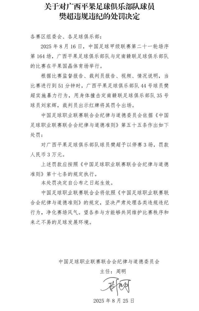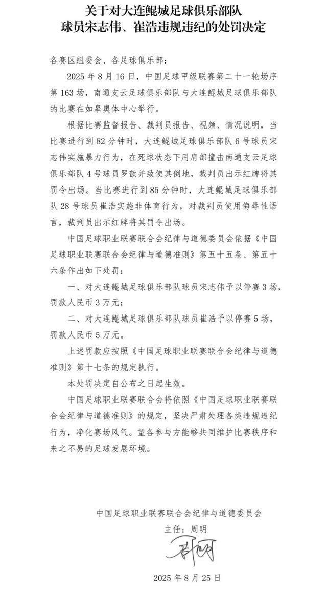 两人都因实施暴力行为,被予以停赛三场、罚款三万元的处罚。